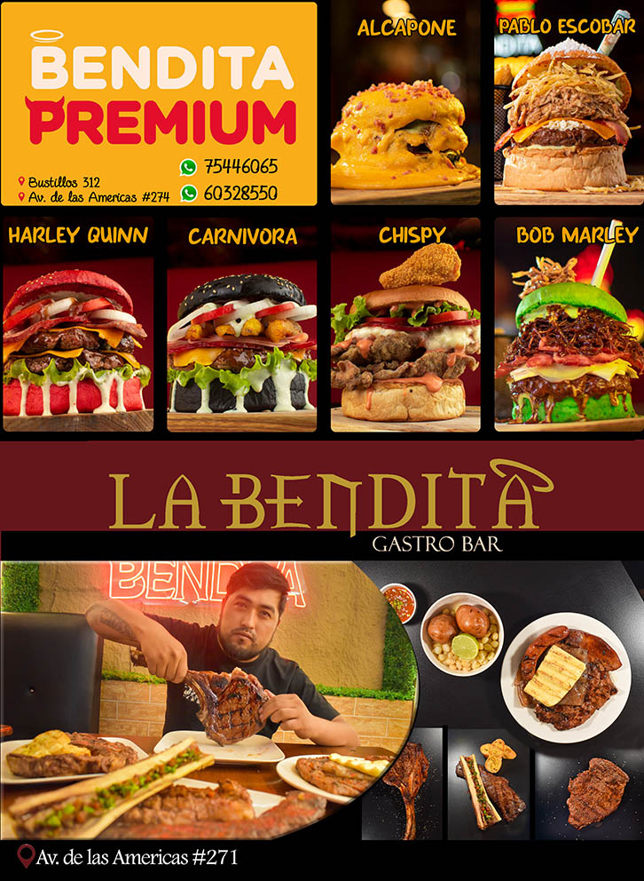 BENDITA PREMIUM admin | agosto 12, 2025 | COMIDAS | No hay comentarios BENDITA PREMIUM ➡ ALCAPONE ➡ Pablo Escobar ➡ Harley Quinn ➡ Carnivora ➡ Chispi ➡ Bob Marley 🏢 Bustillos 312 🏢 Av. de las Americas 274 ☏ 75446065 ☏ 60328550 BENDITA GASTRO BAR 🏢 Av. de las Americas 271 Facebook0 Whatsapp Telegram Messenger TwitterComparte en tus redes Sociales Recuerda dejar tu Comentario Tags:hamburguesas, Sucre Empresas Relacionadas Postres y Pasteles Lúja No hay comentarios | Jun 24, 2025 CHORIPAN «LA CHOCA» No hay comentarios | Ago 4, 2025 Super Tablitas No hay comentarios | Jun 21, 2025 Industrias LIDER ltda No hay comentarios | Jun 20, 2025